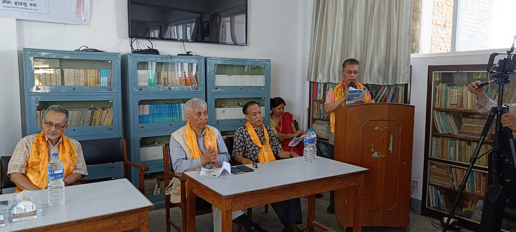 ‘नेवाः बौद्ध हाइकु धें धें बल्लाः कासा’या लिच्वः घोषणालिसें ताःलाःपिन्त सिरपाः लःल्हायेगु ज्याझ्वः जूगु दु । लुम्बिनी बौद्ध विश्व विद्यालयया ग्वाहालिं जूगु ‘नेवाः बौद्ध हाइकु धें धें बल्लाः कासा’या लिच्वः घोषणालिसें ताःलाःपिन्त सिरपाः लःल्हायेगु ज्याझ्वः यलया सातोआकि स्मृति भवनय् सोमबाः जूगु खः ।