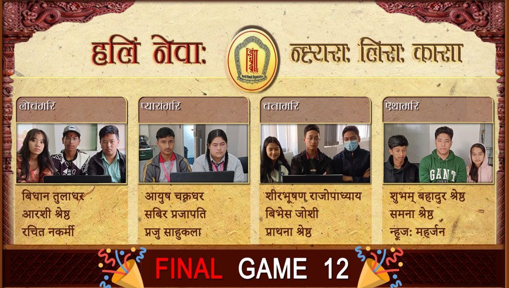 काठमाण्डौं – वर्ल्ड नेवाः अंगनाइजेशन (डब्ल्यूएनओ) ले आयोजना गरेको दोश्रो संस्करणको विश्व नेपालभाषा हाजिरी जवाफ प्रतियोगिताअन्तर्गत फाइनल गेममा ल्वंचामरि पहिलो र अँयठामरि दोश्रो भएका छन्।