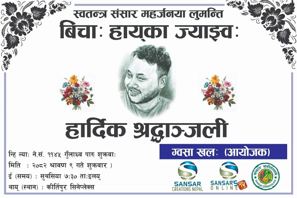 श्रध्दाञ्जलि सभा संसार क्रियसन्स नेपालको आयोजनाम हुने भएको छ। येही आउने २०८२ साउन ९ गते शुक्रवार कीर्तिपुर सिनेप्लेक्स, कीर्तिपुर पाङ्गमा बिहान ७:३० बजे सुरुहुने जानकारी परिवारले दिएको छ।