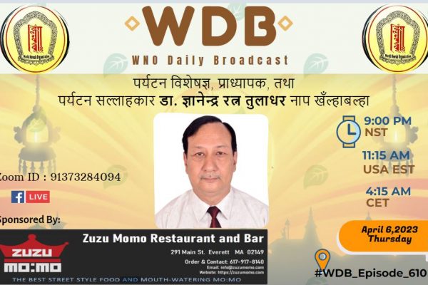 डव्लूडीबिपाखें संचारकःमि विगेन तुलाधरं पर्यटन विशेषज्ञ, प्राध्यापक तथा पर्यटन सल्लाहकार डा. ज्ञानेन्द्र रत्न तुलाधर नाप हालय् पर्यटनया थीथी पक्षयात कःघाना खँल्हावल्हा न्ह्याकेगु याःगु दु । उगु खँल्हाबल्हाय् डा. तुलाधरं पर्यटनया आपालं पक्ष जूगु खँ कनादीगु दु । नापं वय्कलं नेपाःमिपिन्सं…