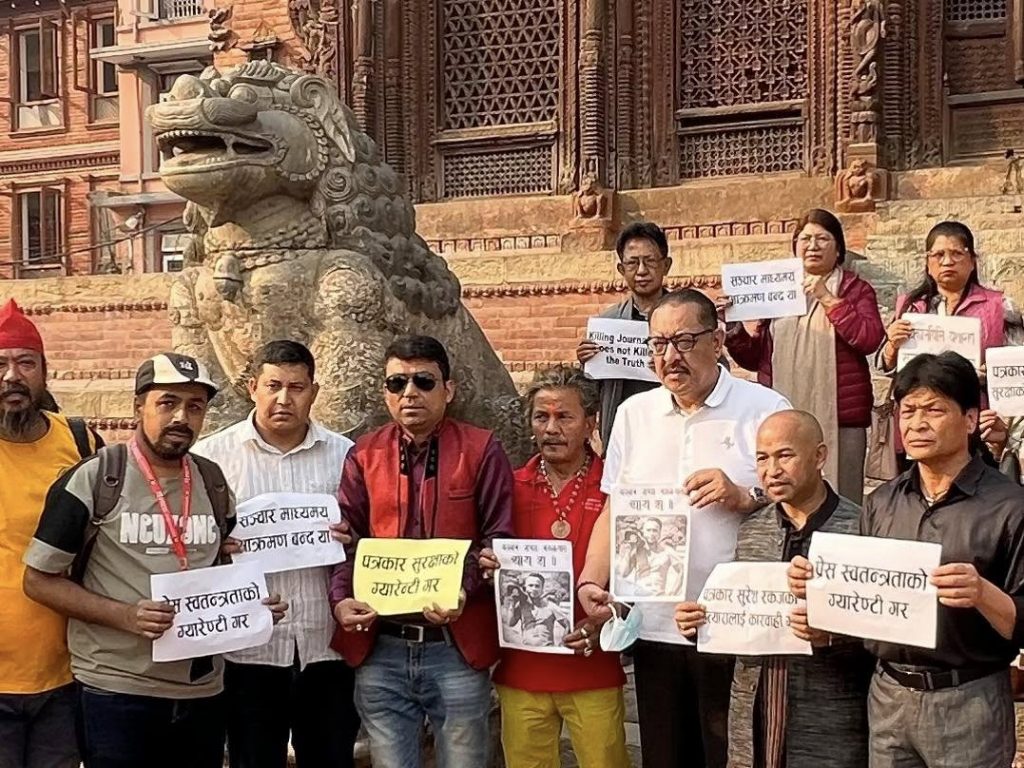 सञ्चारगृहमाथि भएको आक्रमण र सञ्चारकर्मी मारिएको विरोधमा पत्रकार राष्ट्रिय दबूले आईतबार वसन्तपुरस्थित महादेव पार्वती डबलीमा धर्ना दिई सो माग गरेको हो ।