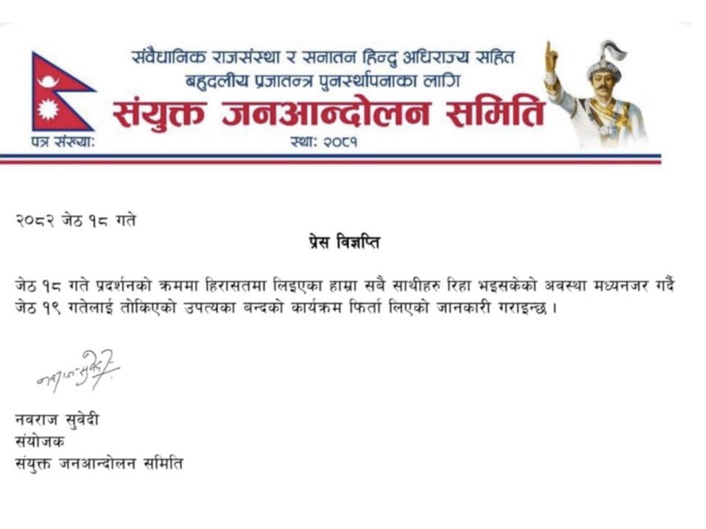 काठमाडौँ । संयुक्त जनआन्दोलन समितिले जेठ १९ गतेका लागि घोषित उपत्यका बन्दको कार्यक्रम फिर्ता लिएको छ। समितिका संयोजक नवराज सुवेदीले जारी गरेको प्रेस विज्ञप्तिमा यो जानकारी दिइएको हो।
