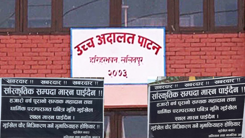 बौद्धधर्म क्षेत्रमा बृहत् रुपमा लिइने गरेको सम्यक महादान गरिने स्वयम्भूको भुइखेलको जग्गा नीजि गुथिबाट ब्यक्तिको नाममा लालपूर्जा बनाएकाहरुले भुइखेलमा भोगचलन गर्न पाउनु पर्दछ भनी काठमाण्डौं महानगर पालिका तथा १५ वडा कार्यालय र भुइखेल टोल सुधार समितिलाई समेत विपक्षी बनाई उच्च अदालत ललितपुरमा दायर गरिएको मुद्दाको पेशीको पहिलो दिन हिजो बुधबार दुई न्यायाधीशबाट– मिसिल झिकाउने आदेश भएको छ । उच्च अदालतमा भएको पहिलो पेशीमा न्यायाधीश टेक प्रसाद गुरुङ्ग र कृष्णराम कोइरालाले भुइखेलको जग्गा नीजि गुठी हुनुअघि कसको हो ?