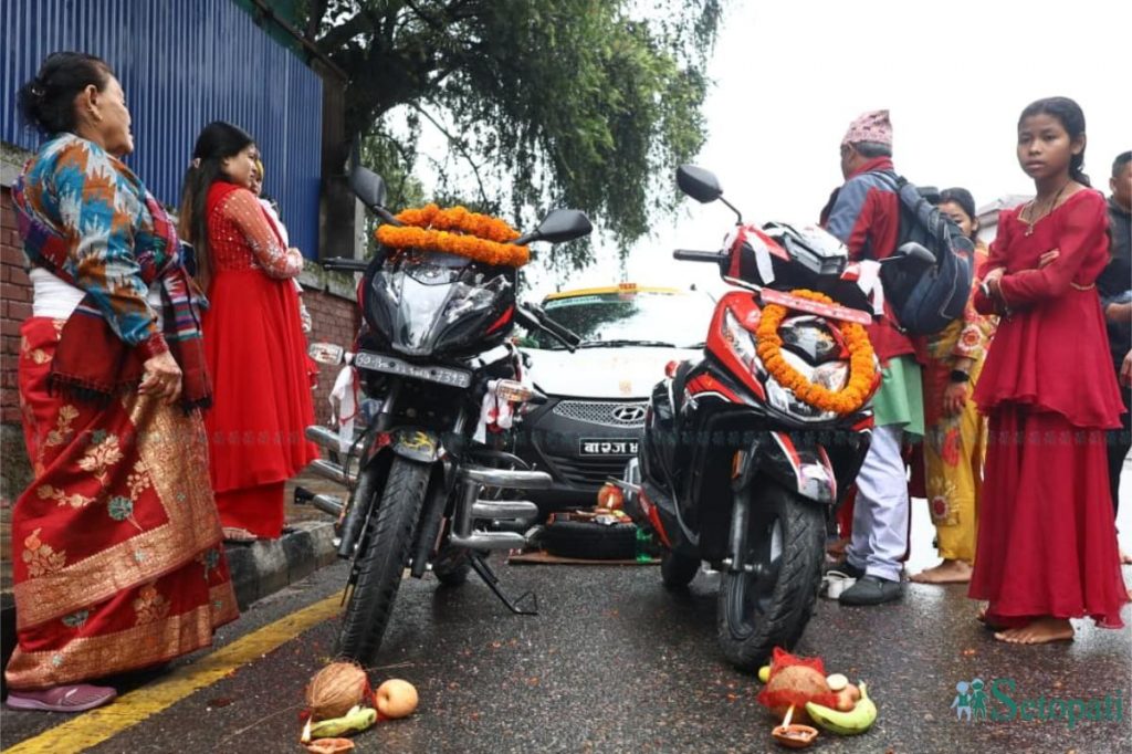 केही मानिसहरू आफ्नो सवारी साधनमा पूजा गरिरहेका छन्। कोही पालो कुरेर बसिरहेका छन्।