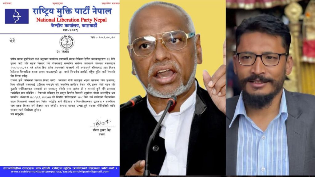 प्रवक्ता रबिन्द्र कुमार श्रेष्ठद्वारा जारी विज्ञप्तिमा भनिएको छ, संघीय सडक सुपरिवेक्षण तथा अनुगमन कार्यालय काठमाडौं, सडक डिभिजन हेटौंडा मकवानपुरद्वारा १५ दिने सूचना जारी गरि सडक विस्तार गर्ने योजनालाई सम्मानित सर्वोच्च अदालतले तत्काल नभत्काउन २०८२/०८/१९ गते आदेश दिदा समेत अदालतको मानहानी गर्दै अन्यायपुर्ण तरिकाबाट आज बिहान हेटौंडामा गैरन्यायिक रूपमा घरहरु भत्काइएको छ। यस्तो निन्दनीय कार्यको राष्ट्रिय मुक्ति पार्टी नेपालले घोर निन्दा गर्दछ।