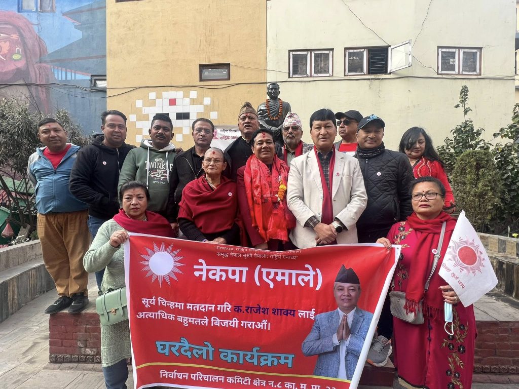 क्षेत्र नम्बर ८ मा उम्मेदवार राजेश शाक्यले विगत केही दिनदेखि घरदैलो कार्यक्रमलाई तीव्रता दिँदै मतदातासँग प्रत्यक्ष भेटघाट र संवादलाई निरन्तरता दिएका छन्। निर्वाचन नजिकिँदै जाँदा एमालेले वडा तहबाटै अभियान सशक्त बनाउने रणनीति अघि बढाएको देखिन्छ।