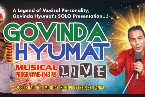 वरिष्ठ संगीतकर्मी गोविन्द ह्यूमतको एकल सांगीतिक कार्यक्रम ‘गोविन्द ह्यूमत सनिल– ११४३’ हुने भएको छ। कीर्तिपुर, पांगा स्थित कीर्तिपुर सिनेप्लेक्स हलमा भाद्र ११ गते सोमबार दिउँसो २.३० बजे कार्यक्रम हुने कार्यक्रम संयोजक विजय लाल डंगोलले बताउनु भयो। उहाँकाअनुसार टिकटको मूल्य पाँच…
